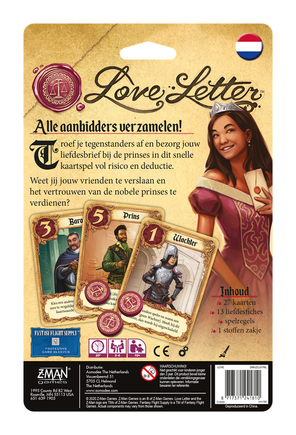 Deze nieuwe versie van Love Letter bevat nieuw artwork van Andrew Bosley en twee nieuwe karakters, namelijk de Kanselier en de Spion, waardoor het spel met maximaal 6 spelers te spelen is.