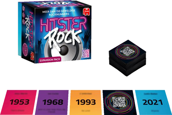 Deze uitbreidingsset bevat 154 kaarten en kan alleen gespeeld worden met 1 van de andere Hitster basisspellen. Voor Wie is Hitster Rock?