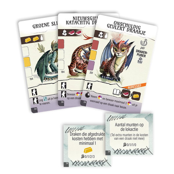 Vervang de benodigde materialen door de nieuwe onderdelen. Voeg vervolgens alle drakenkaarten, grotkaarten, drakengilden en doeltegels aan hun betreffende stapels toe. Besluit een speler te passen, dan biedt het nieuwe rondenspoortableau extra opties. De nieuwe drakenpubers zijn hiernaast op een unieke manier te trainen!